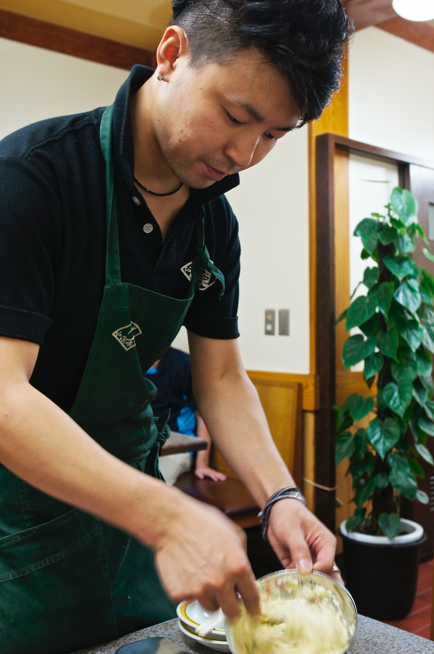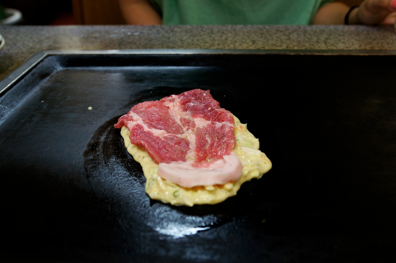 店員很帥氣的幫我們攪拌麵糊,順道一提,在表明日文不是很好之後,這位店員說自己是大陸人,很熱心地為我們講解店裡有什麼招牌料理,最後點了一份炒麵跟千草燒。