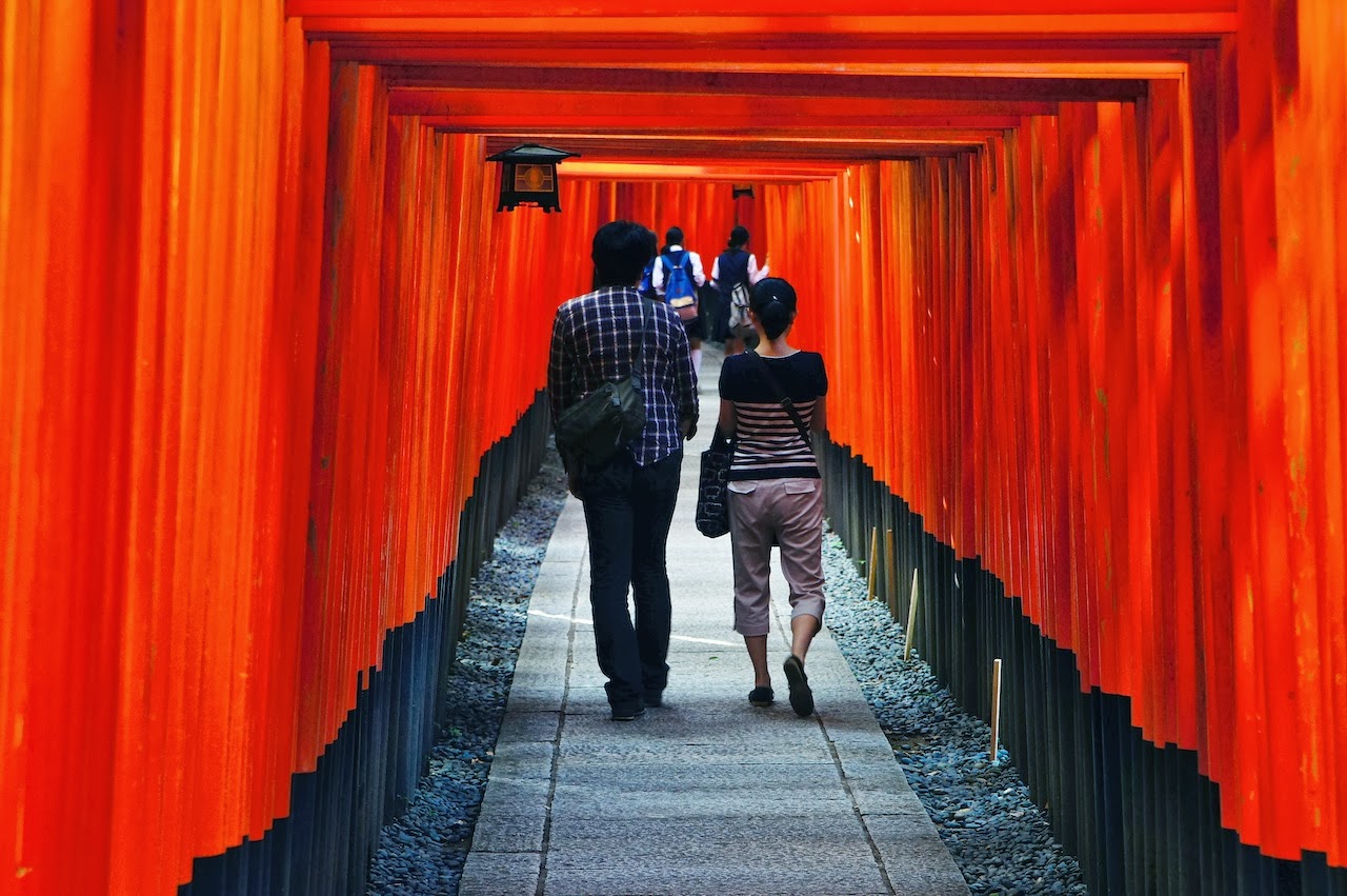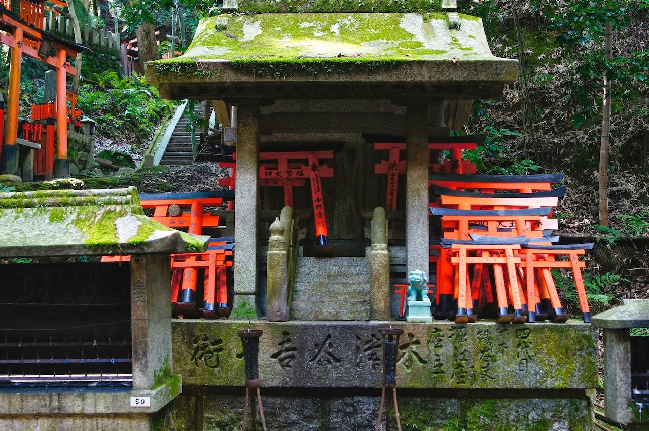 伏見稻荷站下車後沿著指標走一小段路就會到伏見稻荷大社,沿途看得出來已經是有點鄉村的風情了,但這邊仍然是很指標性的一個觀光景點,因此該有的名產店不會少。
