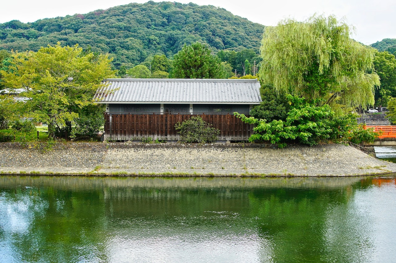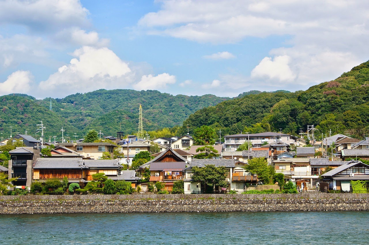 從宇治橋上看出去,一邊是山一邊是鐵道,宇治川的一旁有整排依緩坡而建的住宅。