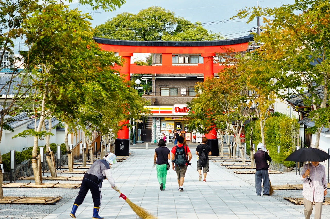 不知道是不是錯過了什麼,沒有從正門的鳥居進入,從廣場的人數可以看得出來遊客並不多,還有神社的工作人員正在灑掃庭院。