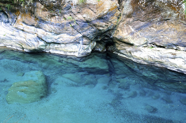 砂卡礑溪水就是清澈,這樣看下去雖然見底,但人下去應該是滅頂的吧。岩壁上水流侵蝕的痕跡、不同的顏色,讓整片山壁就像一幅壁畫,在這裡除了水很乾淨,別忘了大理石峭壁也是太魯閣峽谷的主角。