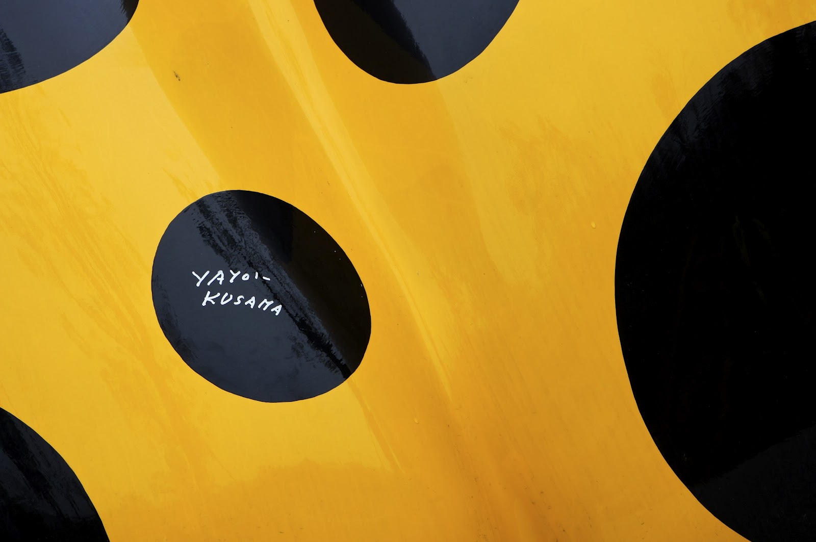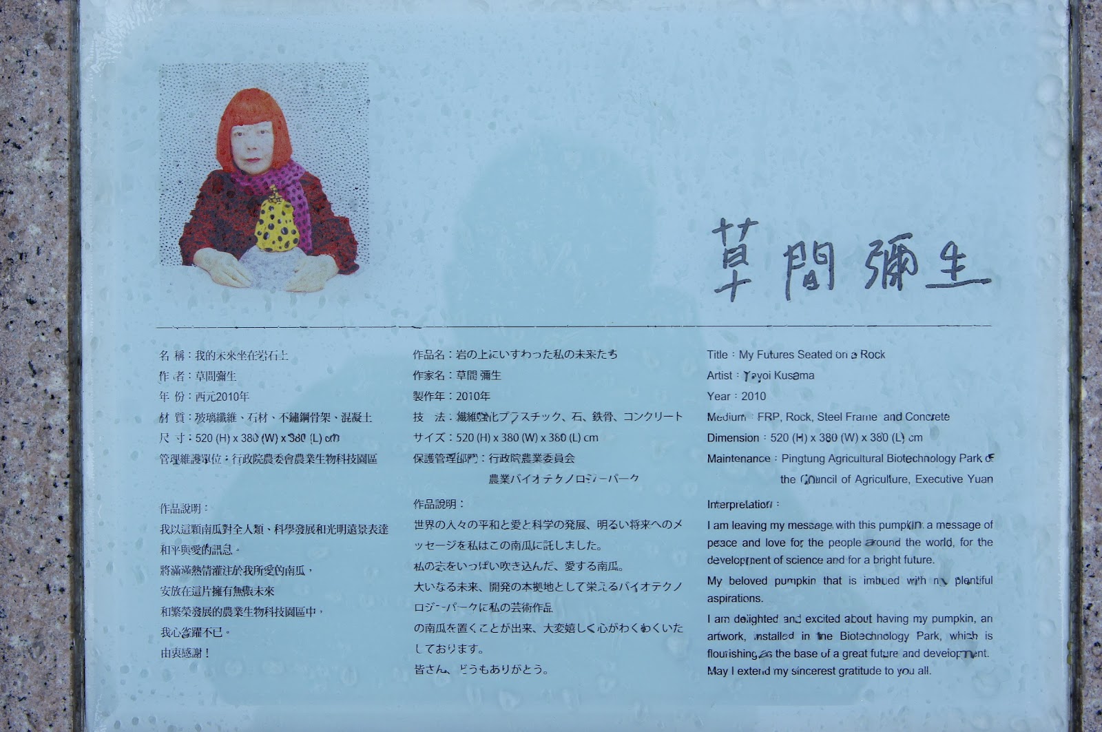 這邊有一個草間彌生的作品-我的未來坐在岩石上,草間彌生是日本的藝術大師,作品以很多的點點為特色,關於草間大師的生平google一下應該很多,事實上我對她也不是很瞭解,但有一次聽了森美術館南條館長的講座,也有提到草間大師,就稍微做一些功課。是說,上次經過內湖科學園區看到某棟大樓一樓似乎也擺了一棵這樣的南瓜?