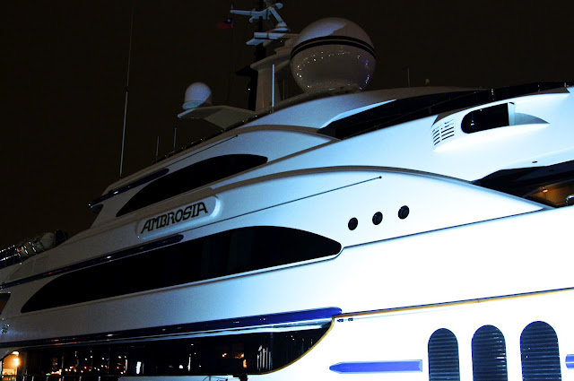 看到一艘豪華遊艇停泊在港口,遠遠看覺得好像沒有什麼,近看發現不得了,比那個愛之船氣派多了,真想上船看看有錢人家的休閒阿。
