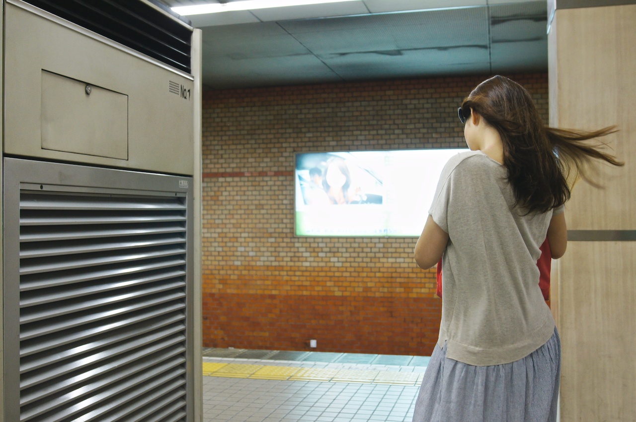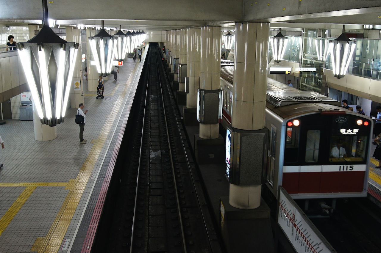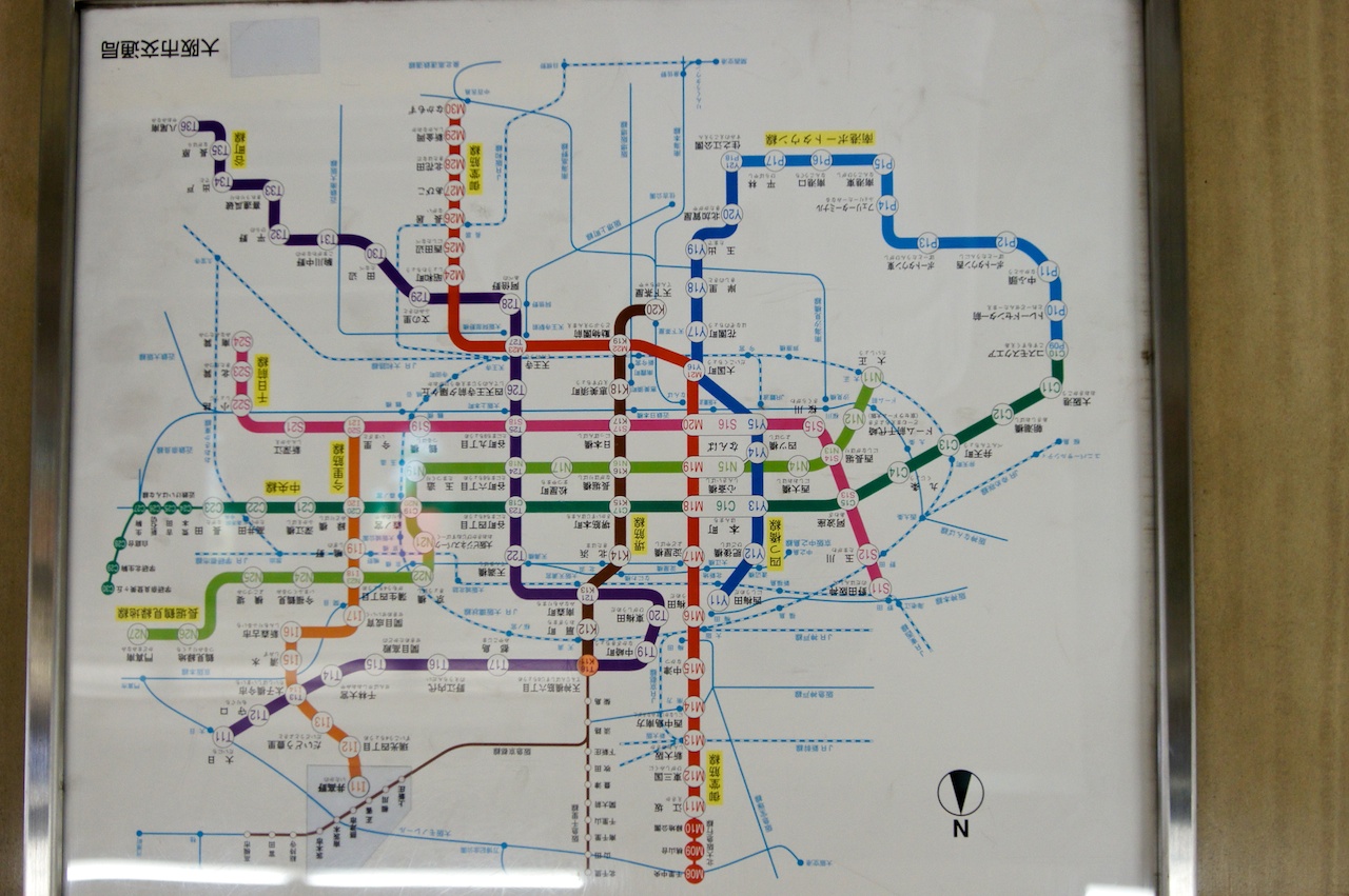 大阪地鐵站月台內挺悶熱的,這時忽然想起某位朋友說日本人會站在冷氣前吹風,沒想到真的被我看到了。又因為等車時候很無聊,把地鐵圖倒過來看會發現一件有趣的事情。
