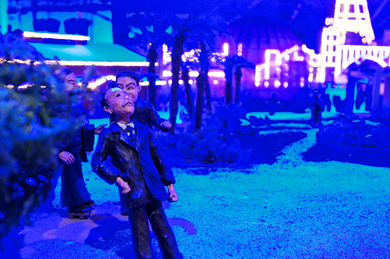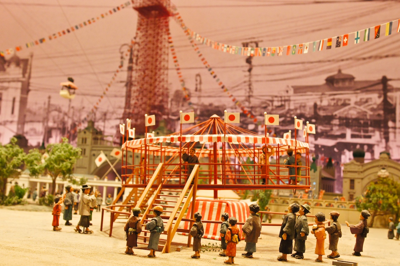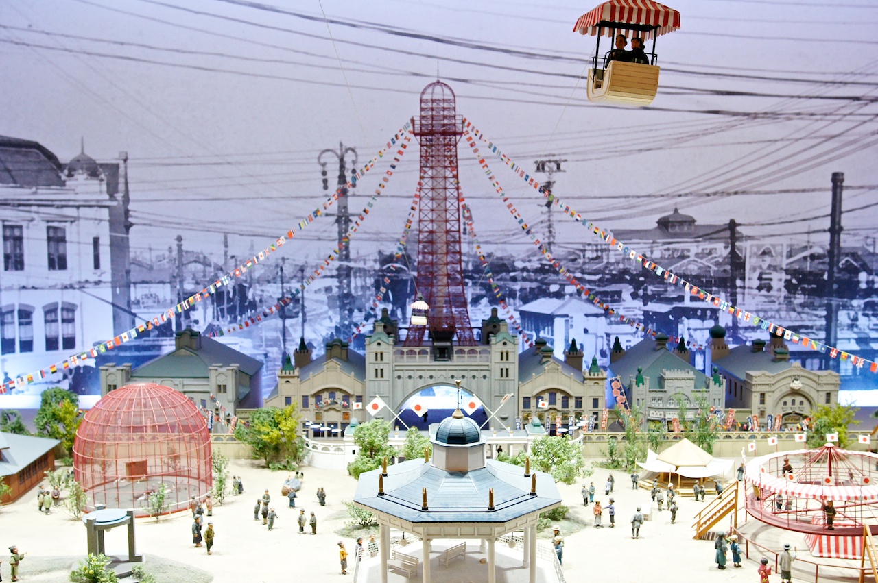 維妙維肖地重現當年通天閣繁華的模型,燈光隨著時間變化而有了晝夜之分,有些設施只有白天會動。