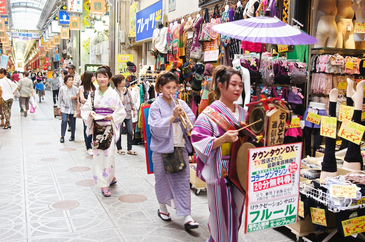 吃飽喝足之後逛了一下天神橋筋,剛好遇到很有趣的宣傳隊伍,至於在宣傳什麼,對我們來說並不重要。