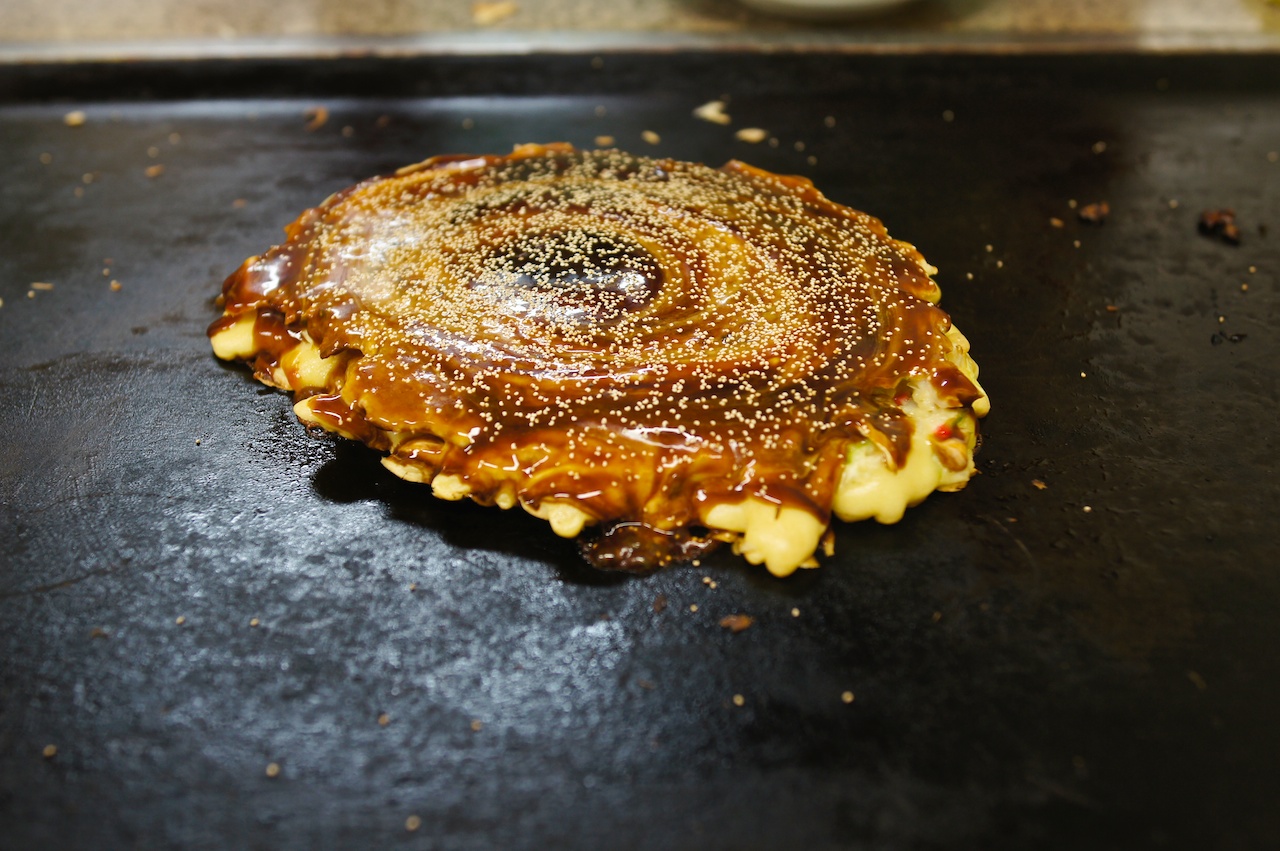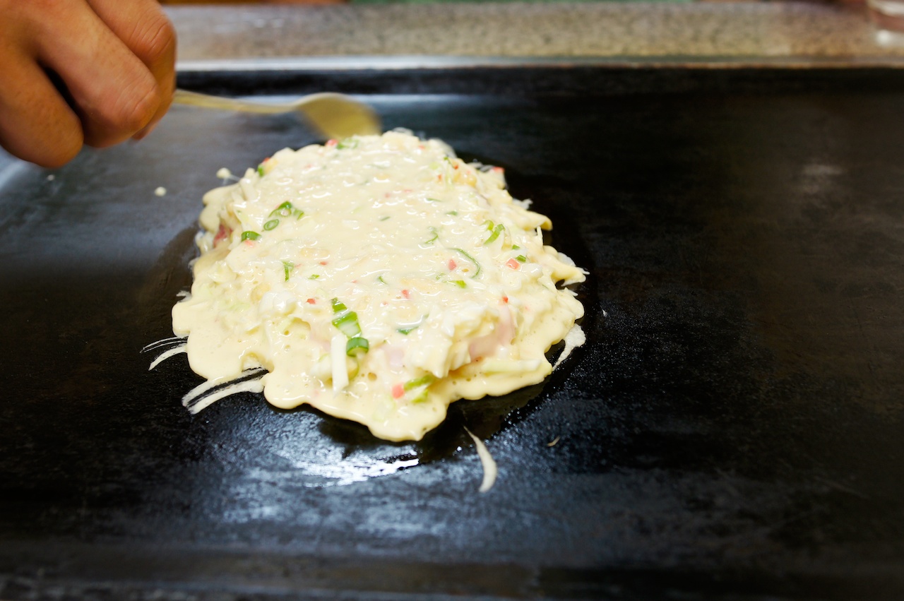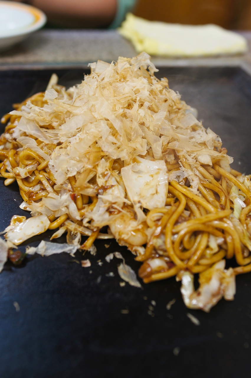 店員很帥氣的幫我們攪拌麵糊,順道一提,在表明日文不是很好之後,這位店員說自己是大陸人,很熱心地為我們講解店裡有什麼招牌料理,最後點了一份炒麵跟千草燒。