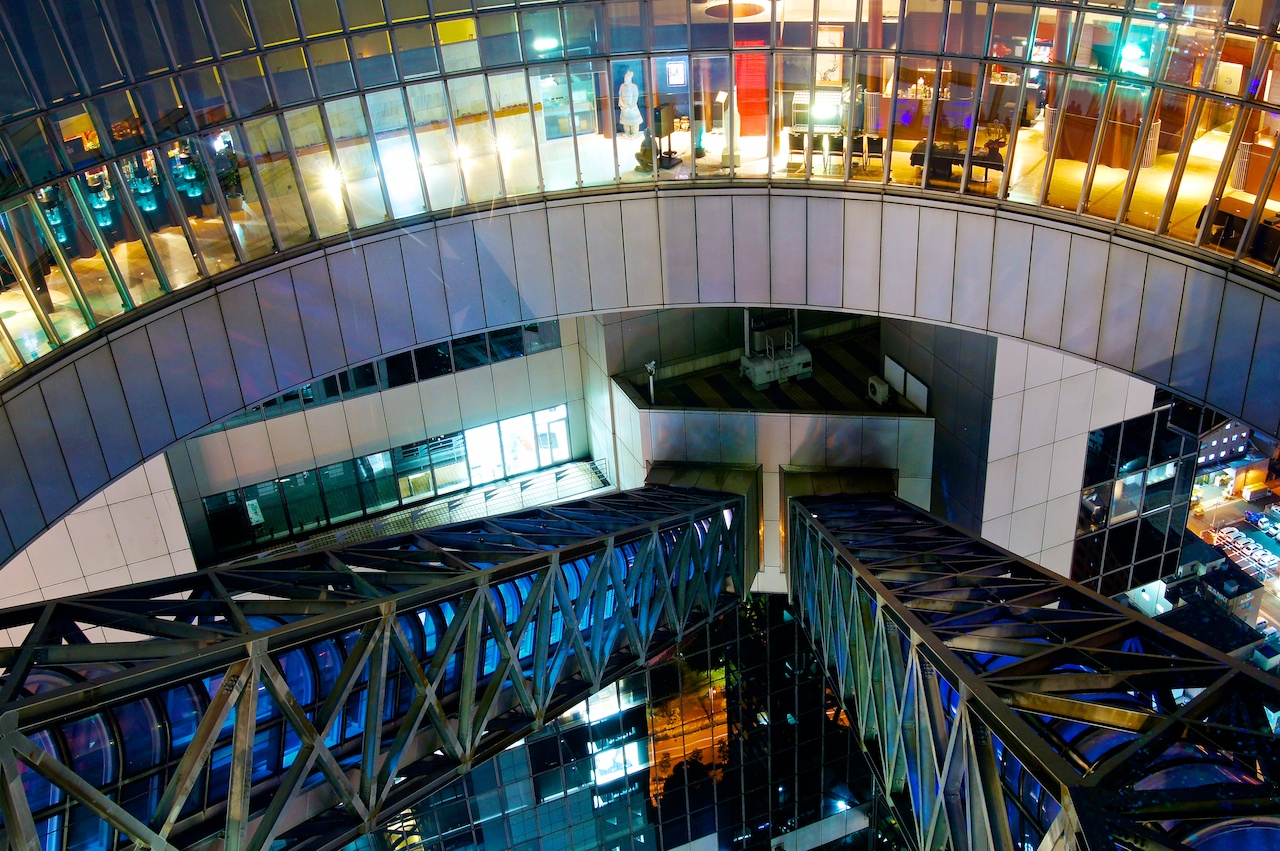 晚上當然還是要去看夜景,不過通天閣上去過了再上去就要另外收費,因此就拍一下外面意思意思,重點還是梅田的空中庭園。空中庭園雖然在梅田,但事實上卻要走上一段路,經過一大片鐵路的下方才能到達。
