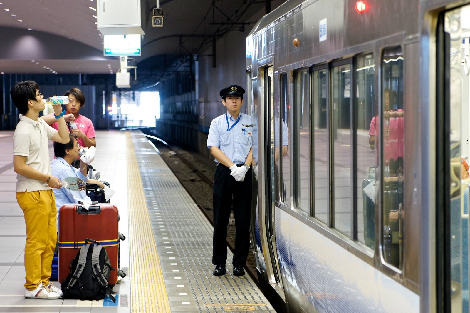 下到月台去發現上一班列車還沒開走就有很多人在排Haruka自由席,只好邊排隊邊拍些照,對我們兩個觀光客來說,什麼都很新鮮。