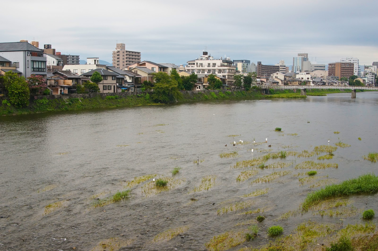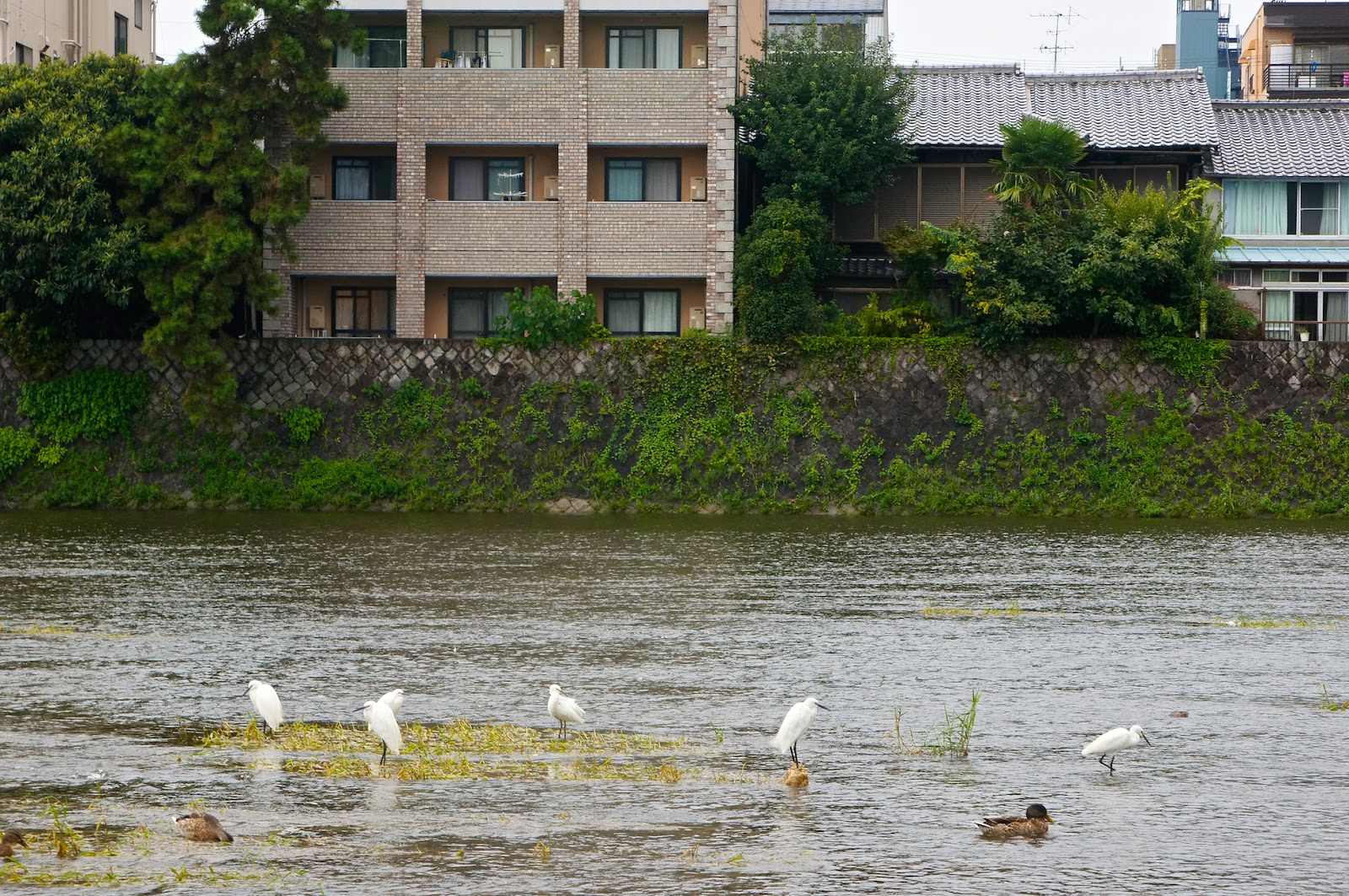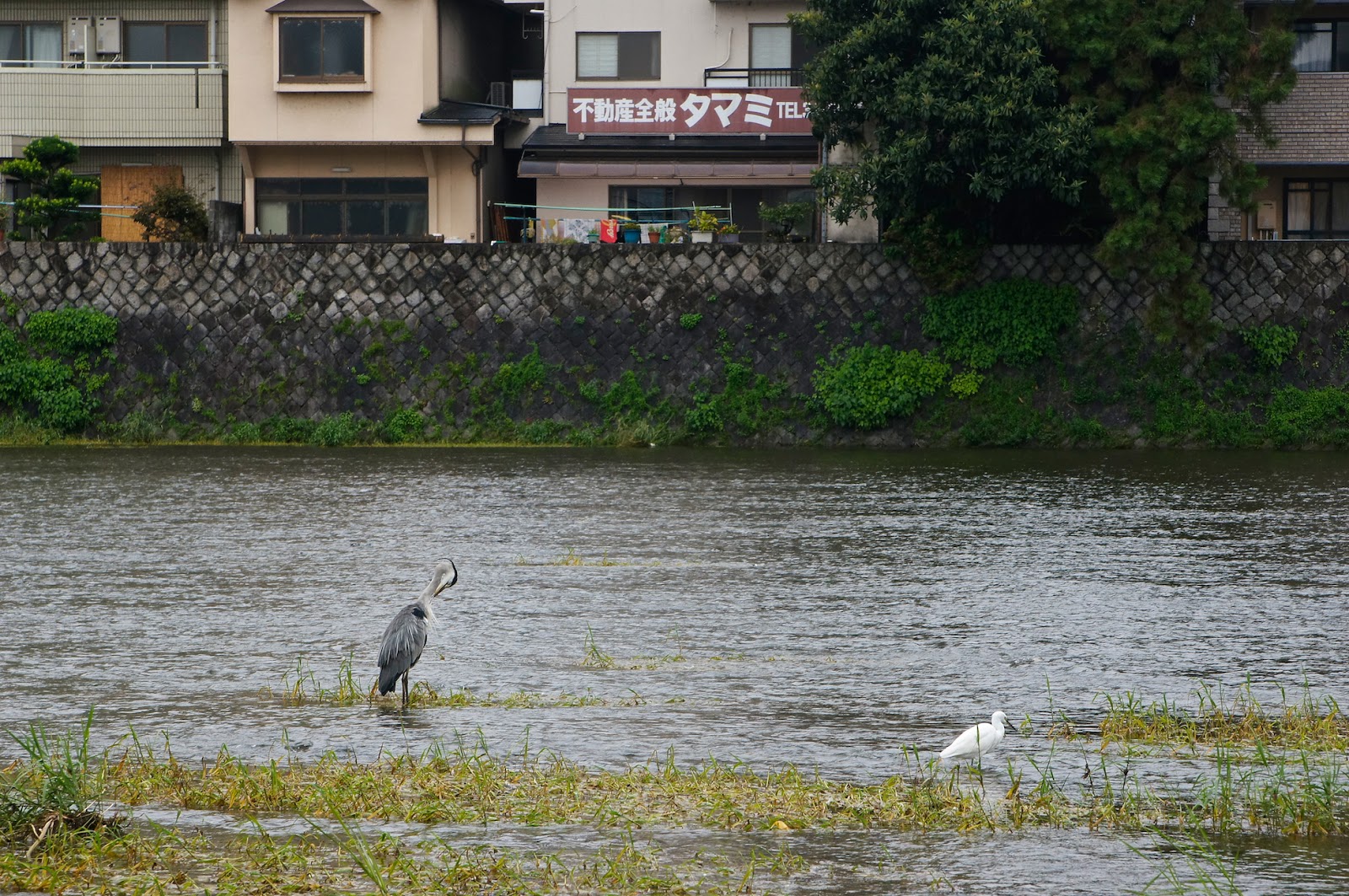 鴨川看起來不深,也挺清澈的,時常看到有鳥類在和中央覓食、爭地盤。