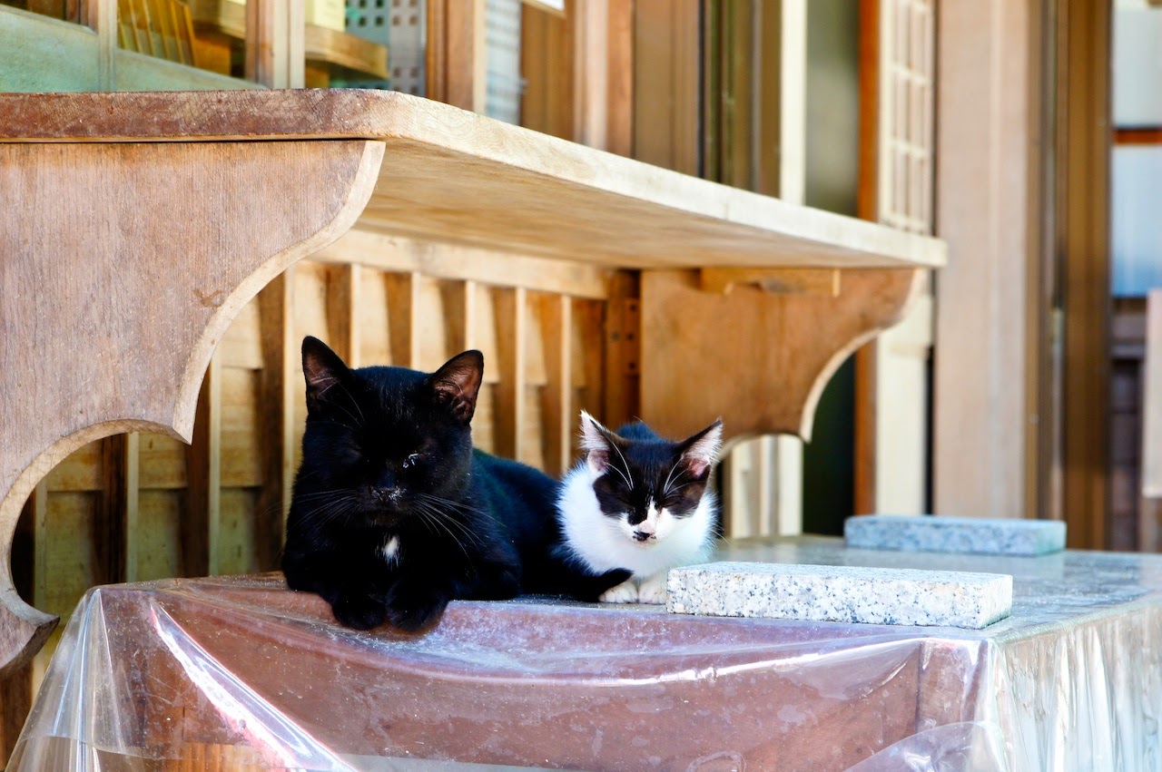 途中遇到兩隻可愛的貓,右邊這隻小貓遠遠地走過來然後跳到黑貓一旁蹲著,不久後兩隻貓一起閉上眼睛...