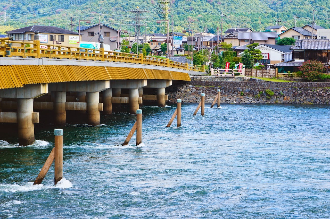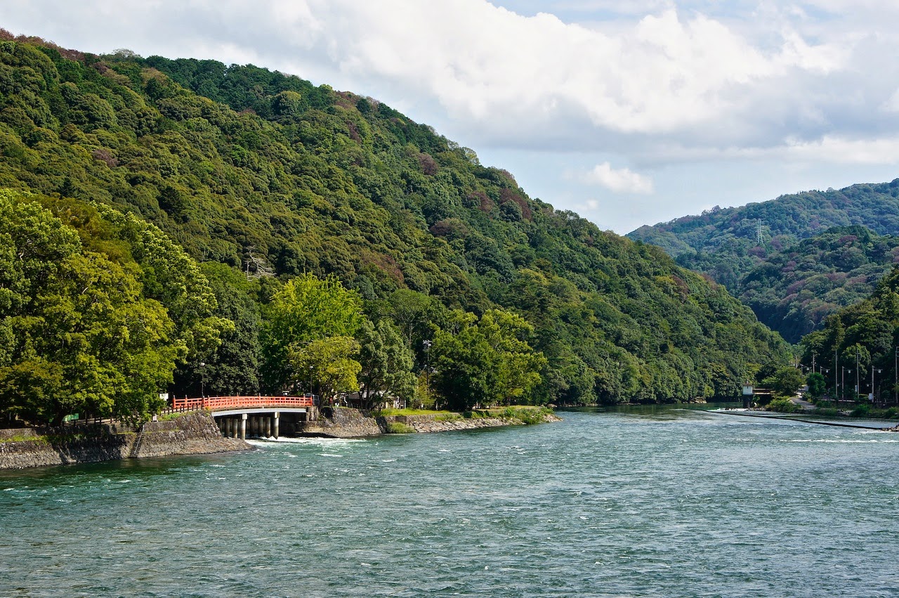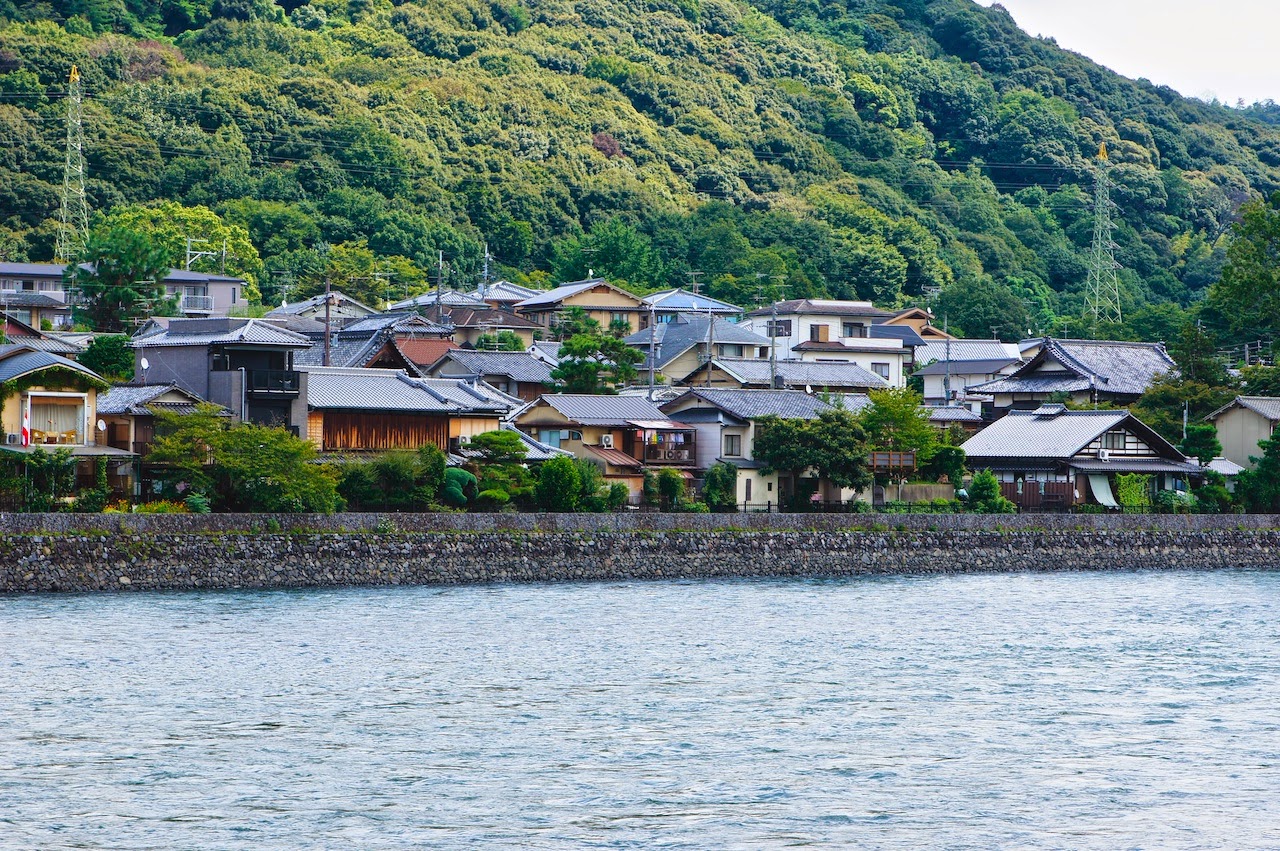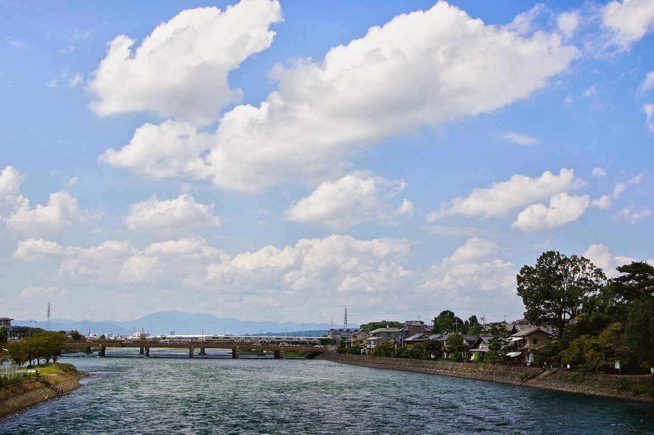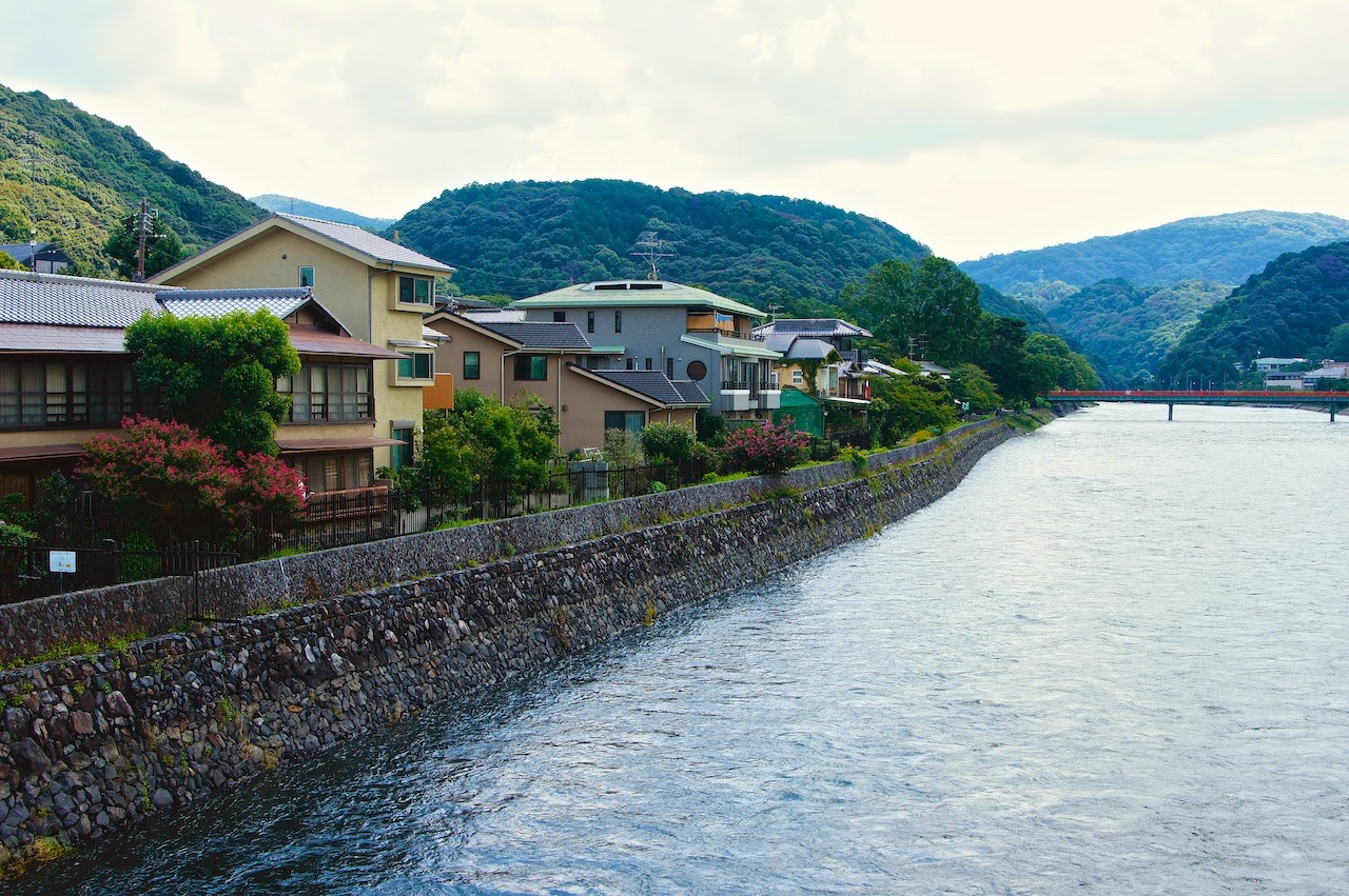 從宇治橋上看出去,一邊是山一邊是鐵道,宇治川的一旁有整排依緩坡而建的住宅。