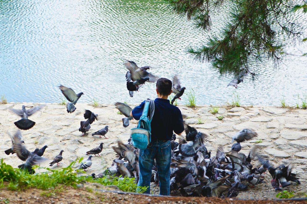 這個人超猛的,走進鴿群餵食。