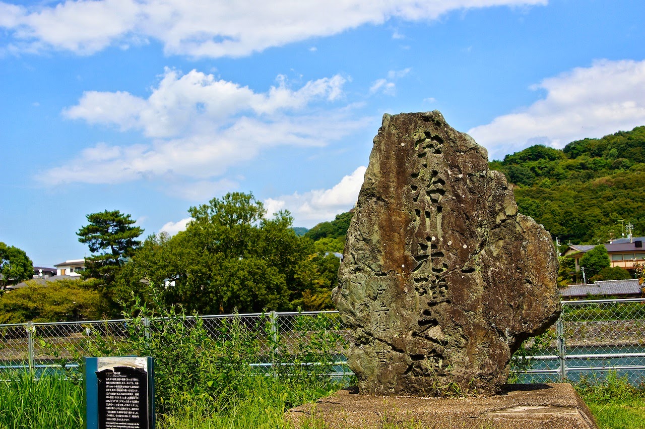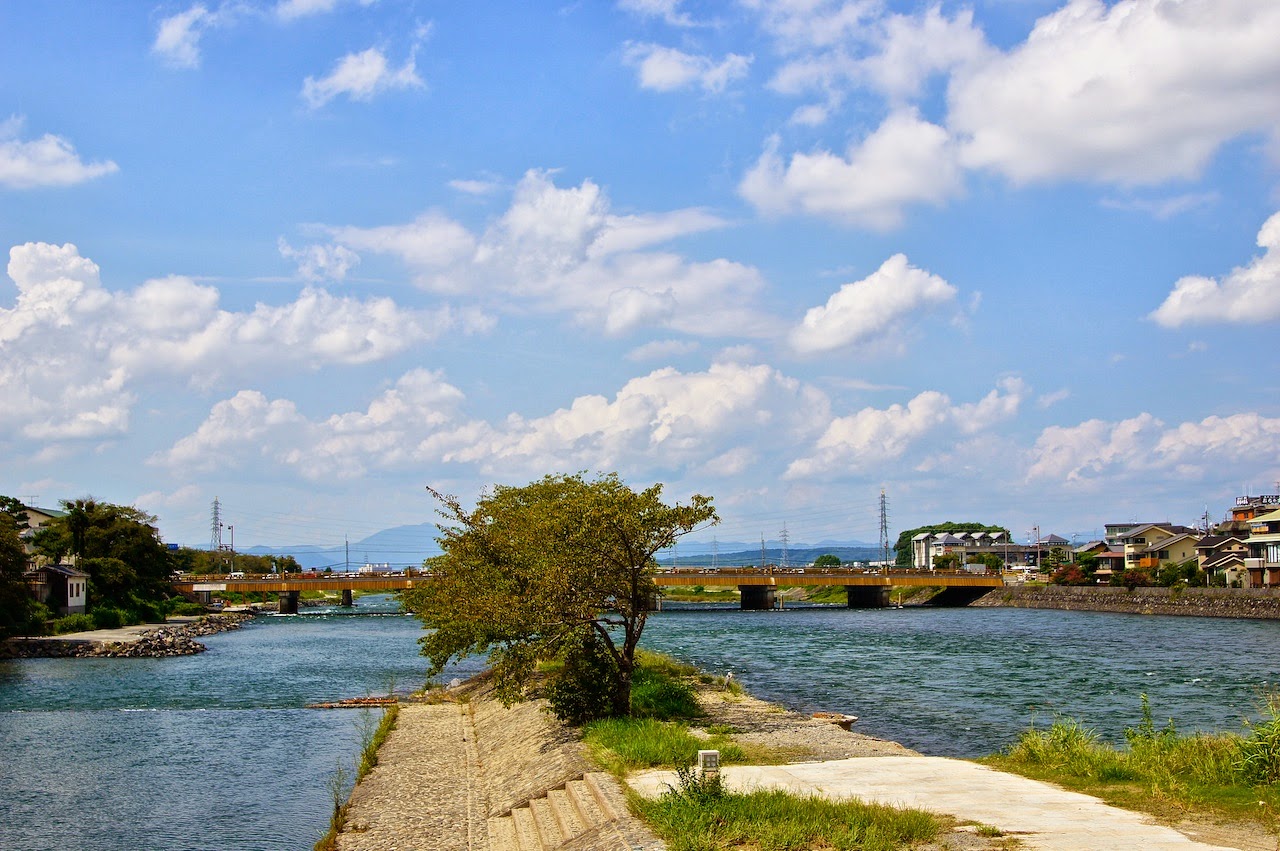從宇治橋上看出去,一邊是山一邊是鐵道,宇治川的一旁有整排依緩坡而建的住宅。