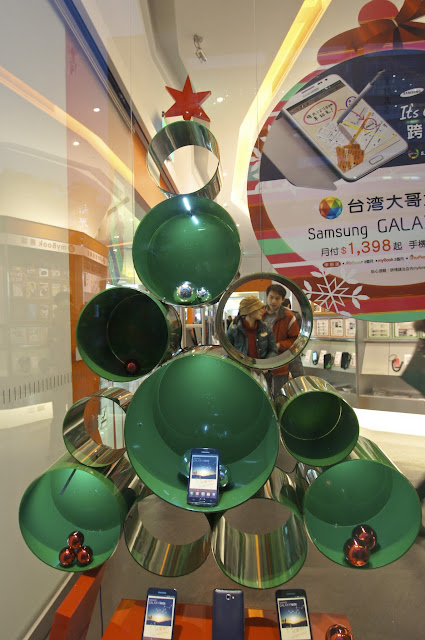 台哥大的櫥窗擺設,很應景地利用聖誕樹格出來的空間作為商品擺設的平台,去年沒注意到,但屬於不小心看到會停下腳步看一下現在主打商品是什麼。